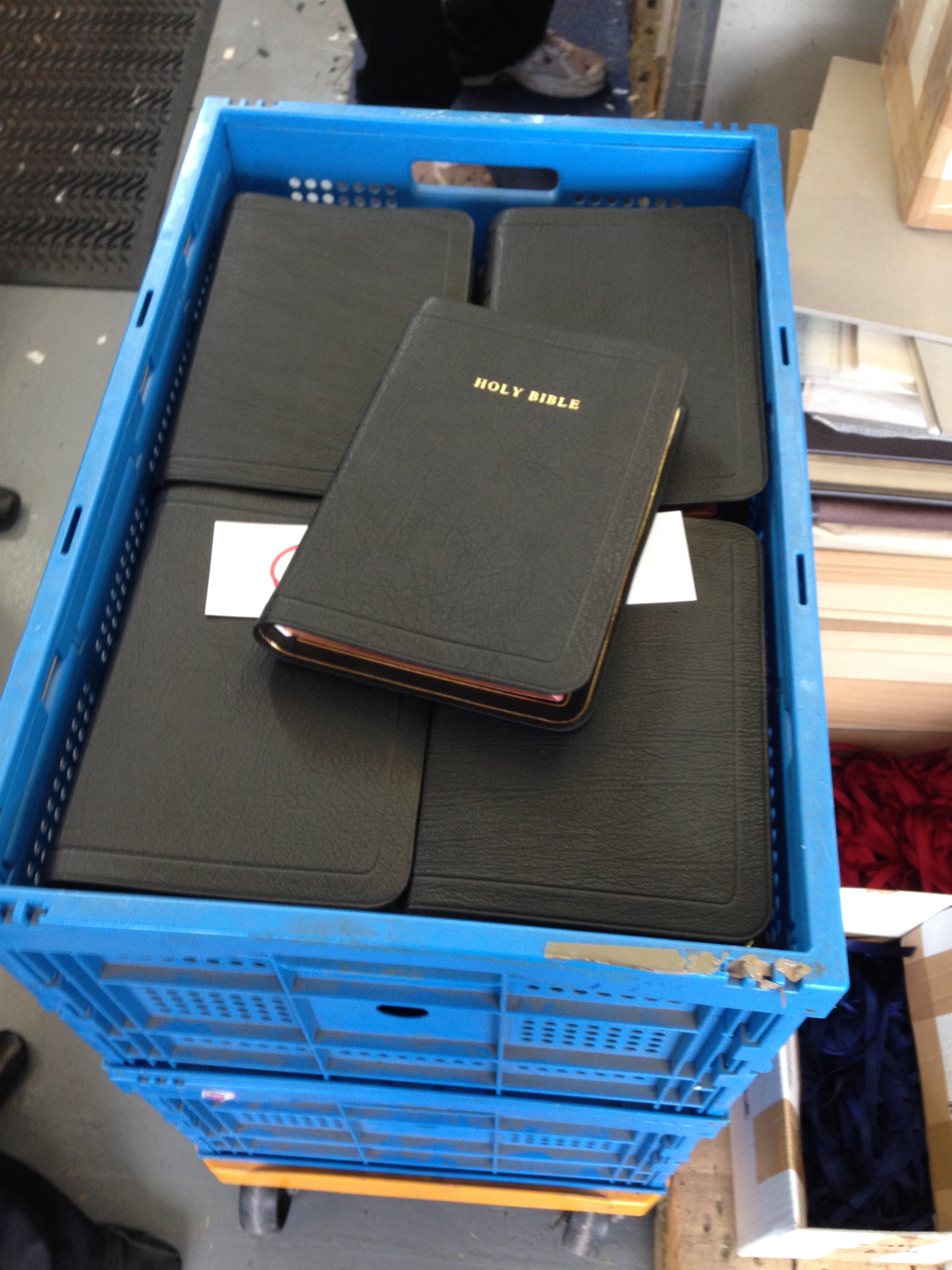 The main purpose of our visit was to catch up on the various projects coming up over the next year or so, and to discuss priorities for those – so stay tuned for updates! However, we did also get the chance to see the NLT Bibles and the last of the Longprimer rebind in the process of being bound. Here are a couple of photos of the ribbons you have all seen in finished Bibles, and some 53s all ready to be banded and boxed – more photos to come in the next day or so.