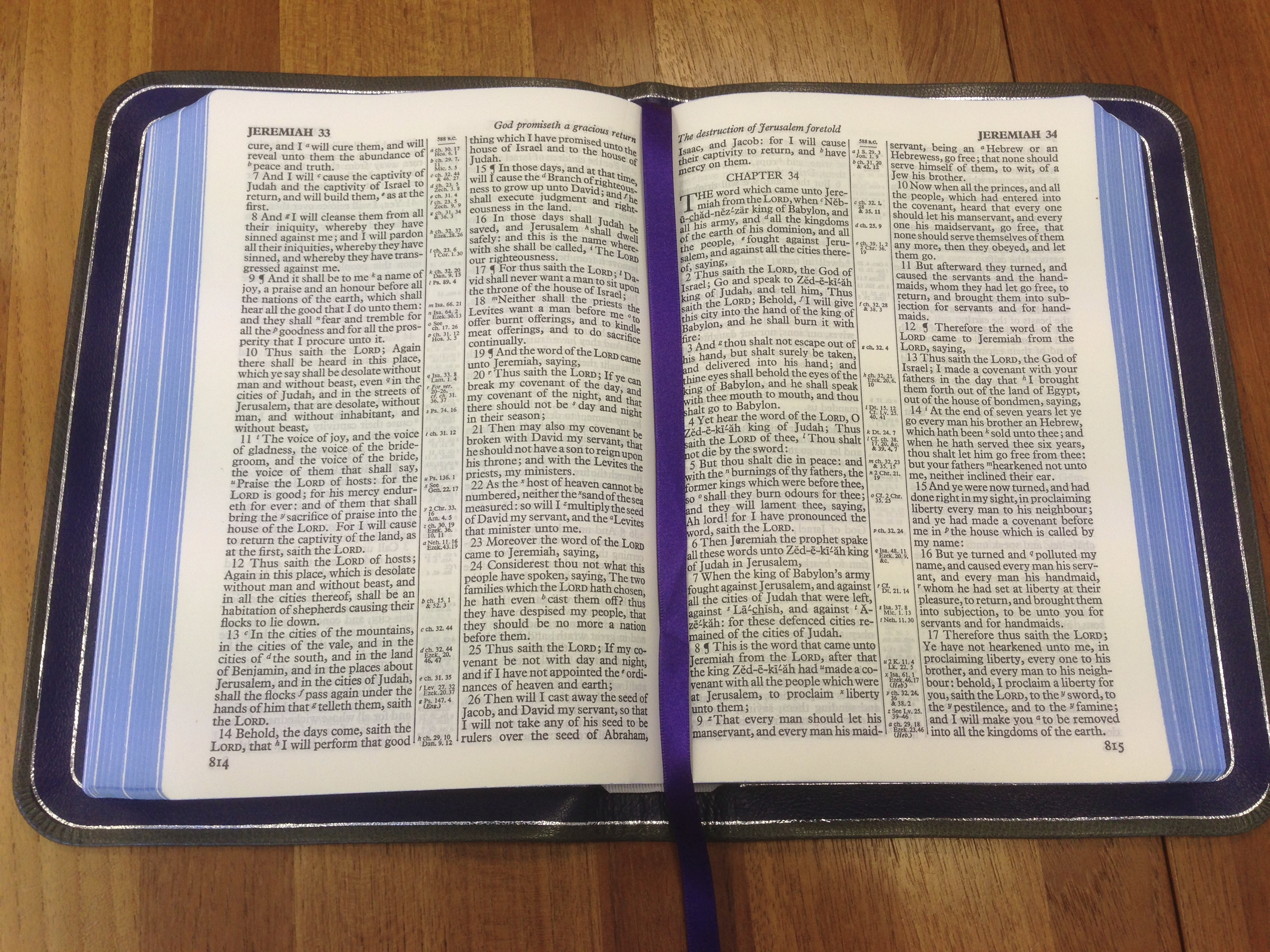 The dark grey leather (selected with the help of our Facebook friends) has revealed its true beauty on this Bible; its natural grain finish has a soft sheen that is subtly distinct from the waxy finish of our trademark highland goatskin. The richly coloured purple lambskin liner, silver foiling and blue under silver art gilt edges combine to give the 53DG a truly sumptuous appearance. For the first time, this Bible will feature our ‘Allan Limited Edition’ stamping on the inside back of the case. It all makes for a worthy addition to the Allan Limited Edition library.