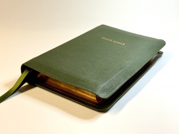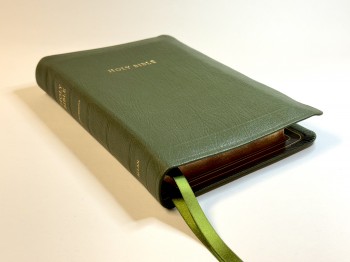 This striking new edition of the Allan 53 Longprimer is bound in Olive Green Highland goatskin with full yapp with red under gold page edges, and is leather-lined in matching olive green with double gilt lines inside and three ribbon markers. It includes presentation pages and family record in Allan's exclusive design, along with Oxford's dictionary of proper names, subject index, concordance, 32 pages of lined writing paper and 16 pages of Oxford Bible maps.