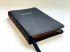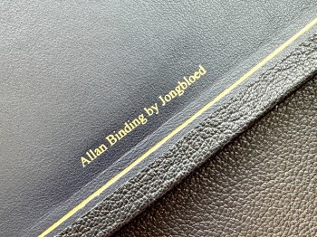 The 44 is bound by Jongbloed in Black natural grain goatskin with generous semi-yapp and red under gold page edges, leather-lined in navy blue Meriva calfskin with gilt line inside and three navy blue ribbon markers. It includes Allan presentation pages and family record, dictionary of proper names, subject index, concordance, 32 pages of Allan feint lined writing paper and 16 pages of Oxford Bible maps.