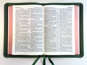 The 44 GRN is bound by Jongbloed in Lincoln Green natural grain goatskin with generous semi-yapp and red under gold page edges, leather-lined in contrasting dark green Meriva calfskin with gilt line inside, three emerald green ribbon markers. It includes Allan presentation pages and family record, dictionary of proper names, subject index, concordance, 32 pages of Allan feint lined writing paper and 16 pages of Oxford Bible maps.