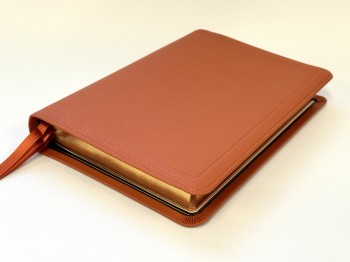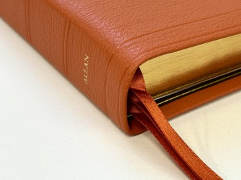 Bound in highest quality natural grain goatskin, this new edition is lined in Meriva natural grain calfskin with a generous semi yapp, gilt line round the inside of the case, art gilt page edges and three 10mm ribbon markers. It includes Allan's 8 page Presentation Page and Family Record, Concordance, full colour maps and 32 pages of lined writing paper.