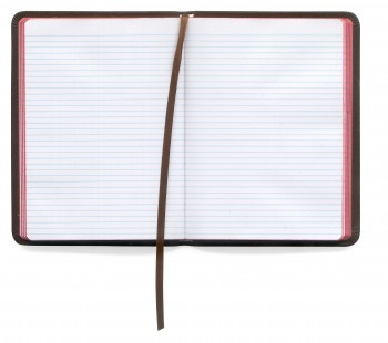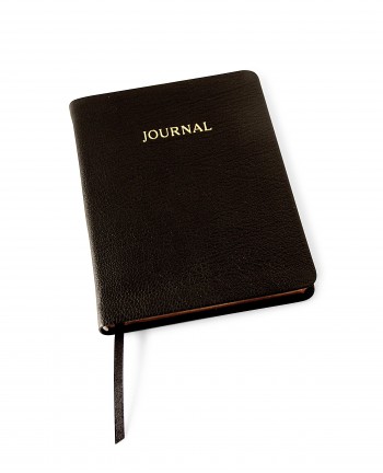 Black Highland goatskin, semi yapp style, red under gold page edges, ribbon marker. 256 pages of lined writing paper printed on lightweight paper.