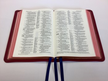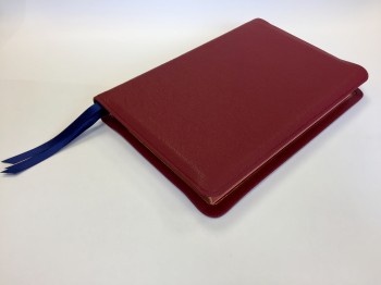 - Red under gold page edges with three navy blue ribbon markers