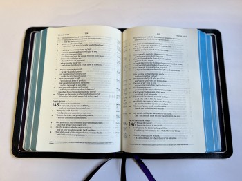 - Blue under silver page edges and three purple ribbon markers