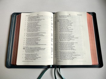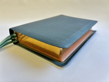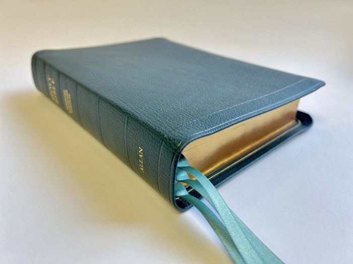 This edition is bound in the Netherlands by Royal Jongbloed in petrol blue natural grain goatskin, leather-lined in petrol blue Meriva Calfskin with three petrol blue ribbons. It comes complete with short book introductions, Allan Presentation pages, 32 pages of Crossway’s full colour maps and illustrations and 32 pages of lined notepaper.